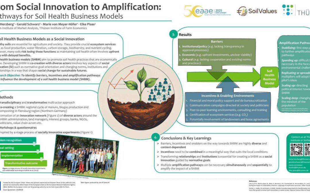 At EAAE congress 2025, SoilValues presented the poster: “𝐅𝐫𝐨𝐦 𝐒𝐨𝐜𝐢𝐚𝐥 𝐈𝐧𝐧𝐨𝐯𝐚𝐭𝐢𝐨𝐧 𝐭𝐨 𝐀𝐦𝐩𝐥𝐢𝐟𝐢𝐜𝐚𝐭𝐢𝐨𝐧: 𝐏𝐚𝐭𝐡𝐰𝐚𝐲𝐬 𝐟𝐨𝐫 𝐒𝐨𝐢𝐥 𝐇𝐞𝐚𝐥𝐭𝐡 𝐁𝐮𝐬𝐢𝐧𝐞𝐬𝐬 𝐌𝐨𝐝𝐞𝐥𝐬”